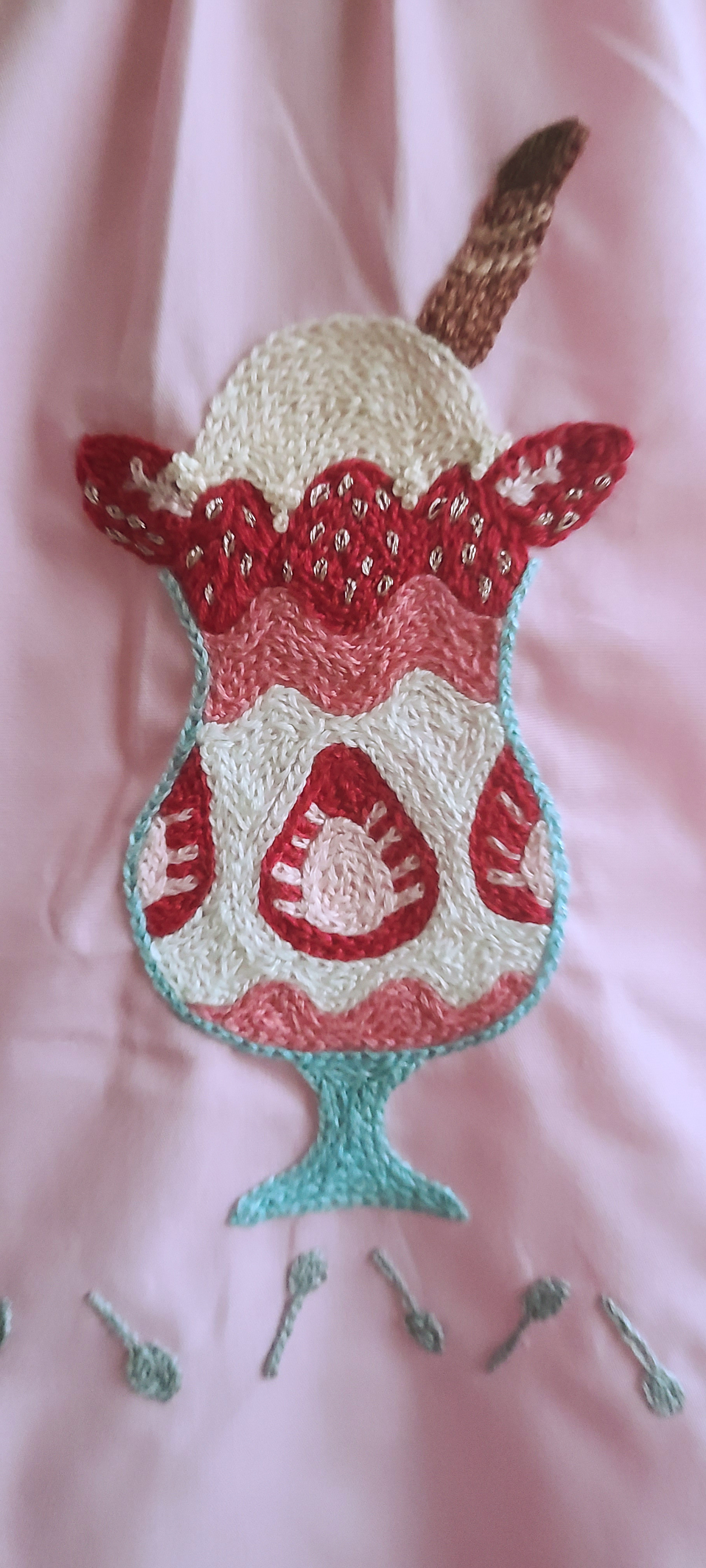 オオカミが木のかげから狙っているとは知らない赤ずきんちゃんが、おばあさんの家へ花を摘みながらランランと歩いている場面を手刺繡しました。